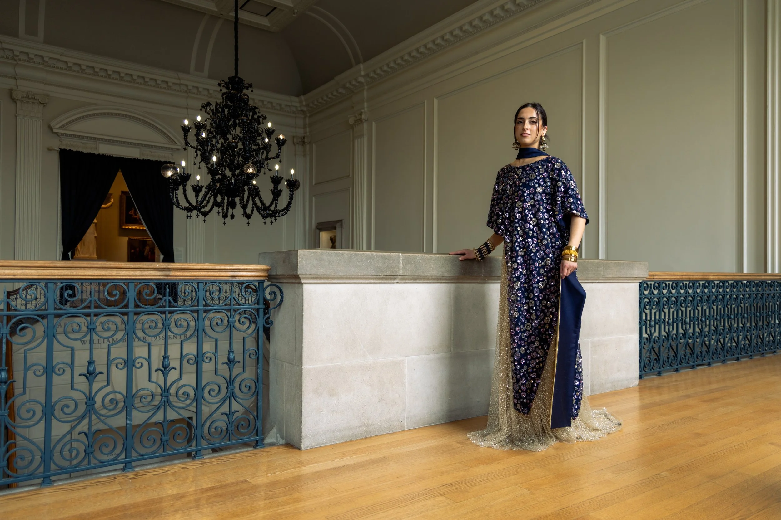 Sitara—the Urdu word for shining star—draws from the richness of Pakistani culture, reimagining traditional bridal wear through a modern lens. This look celebrates heritage and identity, blending intricate embellishment, fluid drapery, and rich textiles to evoke the grandeur of South Asian weddings. Utilizing zero-waste techniques, the design connects contemporary form with timeless tradition—a radiant expression of woman-hood, celebration, and legacy.